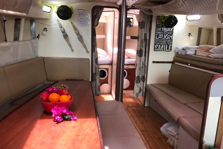 Prima has a range of private cabins and open plan style accommodations to suit everyone. There are two private double cabins with ensuite bathroom facilities, two private double cabins with shared bathroom facilities and a double bed, and two single beds in open-plan accommodation with shared bathroom facilities.